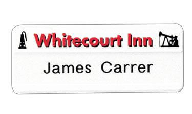Custom Printed Tape Slot Badges. Hot stamped one color imprint (two color imprint shown). Safety pin attachment included in price. Overall Size: 2 3/4” x 1” Imprint Areas: 2 1/2” x 3/8” Tape Slot Size: 1/2” Badge Color: White